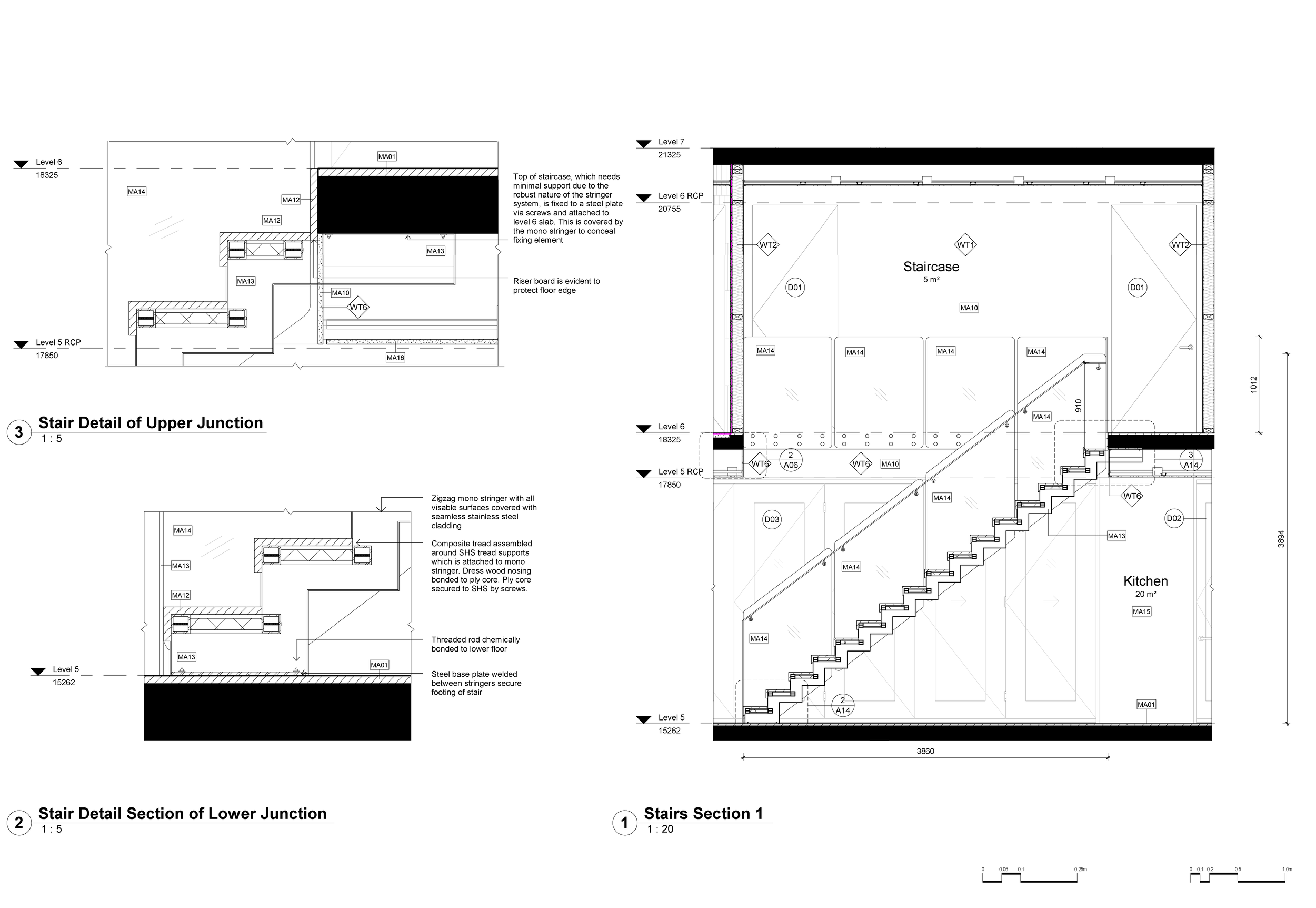 Design and fully document a new stair connecting Levels 5 and 6, ensuring compliance with structural and code requirements.