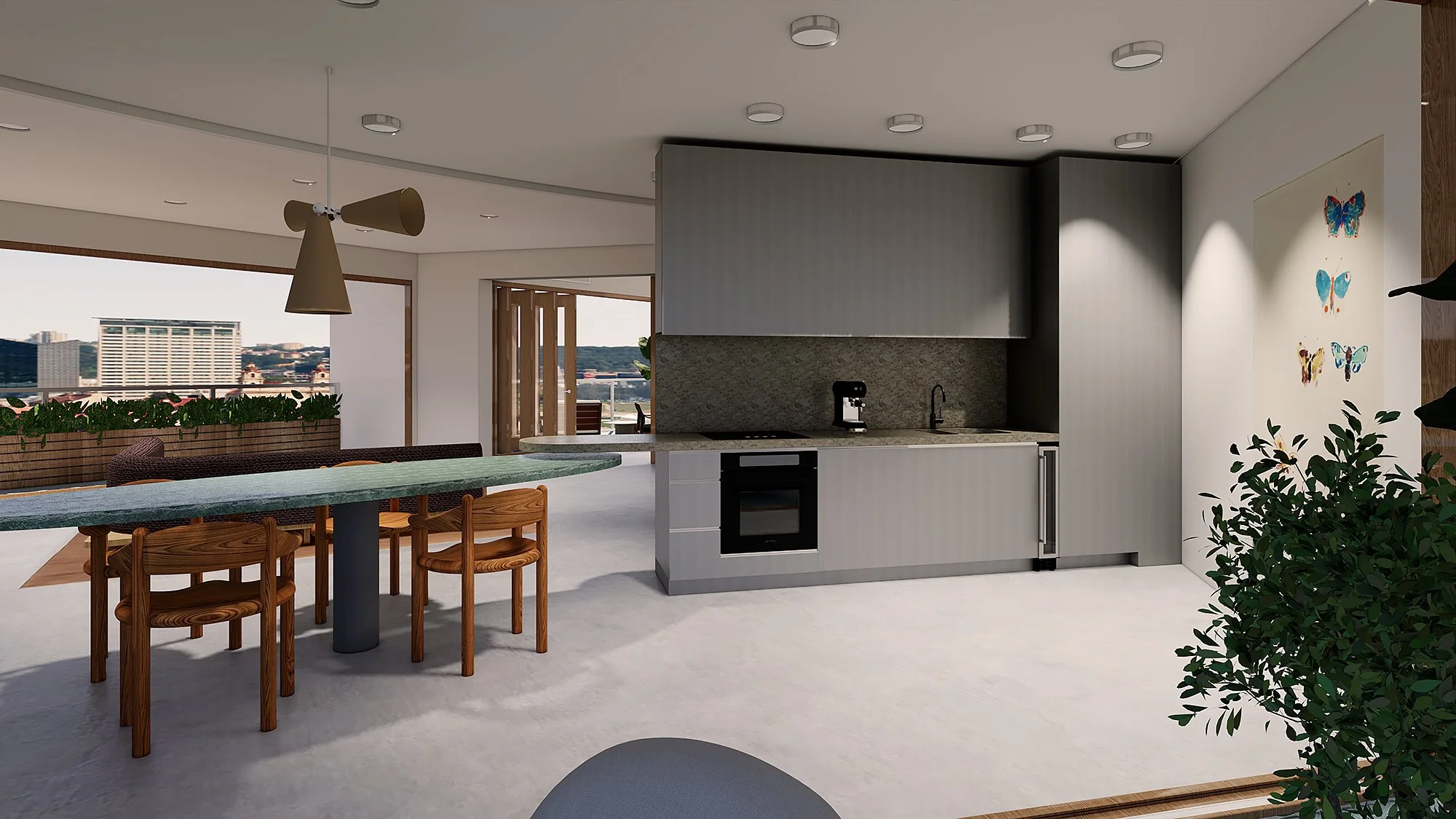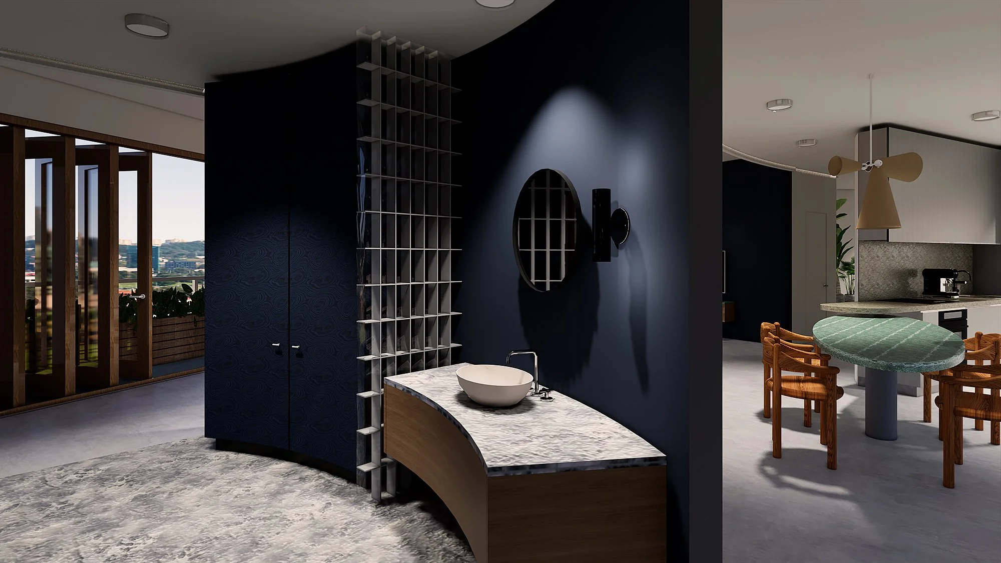 The apartments serve as sanctuaries from the city’s energy - a place of pause within the movement of modern life. Interiors echo the building’s sculptural form through fluid layouts, soft curves, and layered transitions. Brushed metals, natural stone, and textured textiles shift with light to create visual depth, while muted palettes, low curved seating, and natural materials shape a calm, sculptural retreat.
