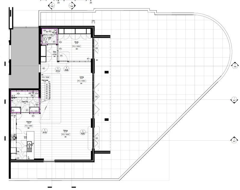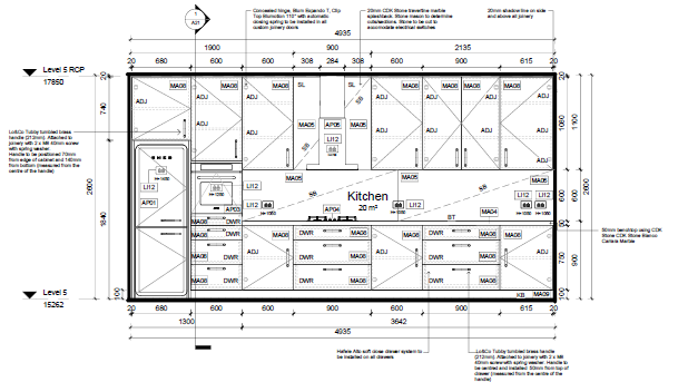 Custom-design and document all joinery throughout the apartment, including the kitchen, living areas, bedrooms, and wet areas.
